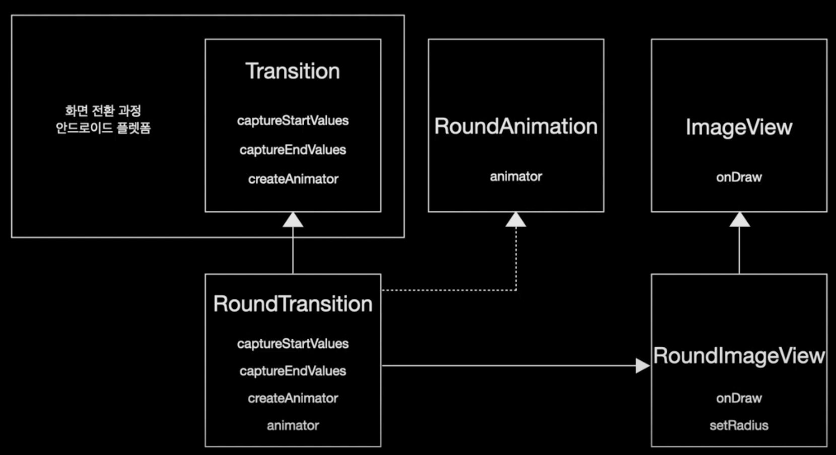 👉Round Animation 효과를 주기 위해 RoundTransition을 구현한 클래스 다이어그램