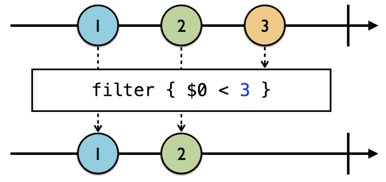 앞서 살펴보았던 ignoreElements와 elementAt은 방출되는 element를 필터링합니다. 만약 우리가 필터링 하고싶은 요구사항이 한 가지 이상일 때는 filter를 사용하면 됩니다. 아래 예시를 살펴보면, 값이 3 미만인 element들만 방출되는 것을 알 수 있습니다.