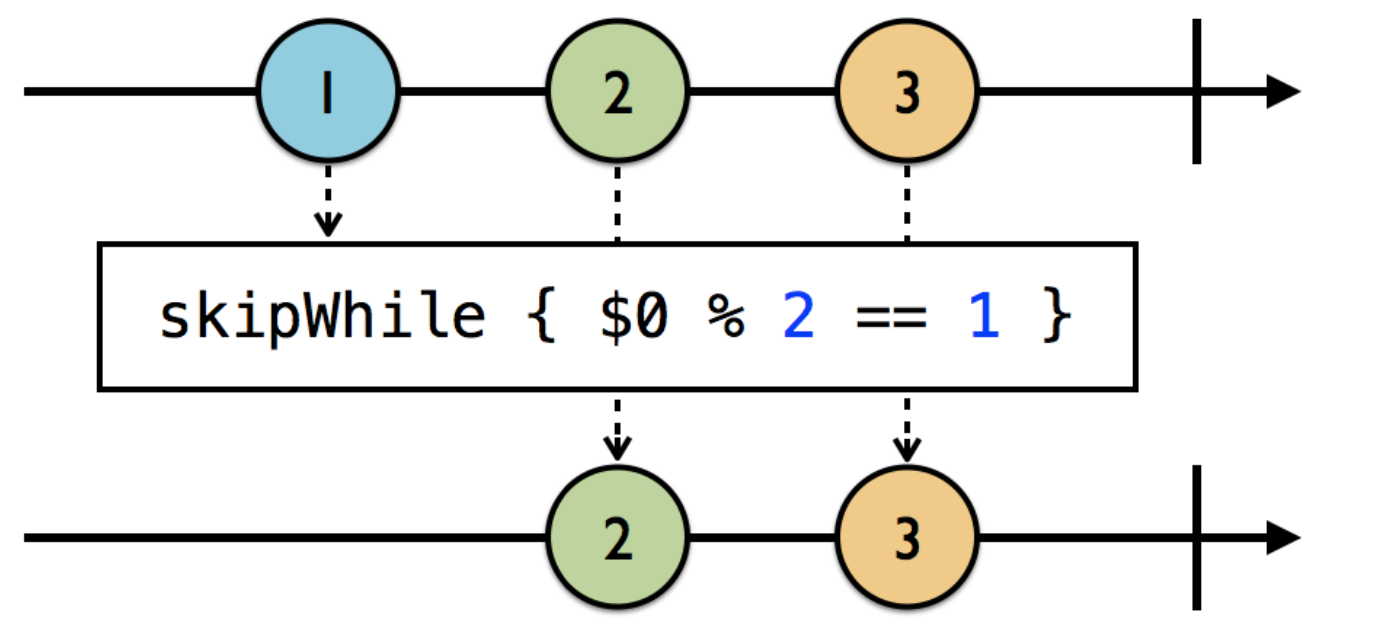 subscribe하는 동안 모든 element들을 필터링하는 filter와 달리, skipWhile은 어떠한 element를 skip하지 않을 때까지 skip하고 종료하는 연산자입니다. 이게 무슨 말이냐! 하면.. 어떤 skipWhile 조건에 맞는 element들을 skip하다가, 어느순간 그 조건에 맞지 않는 element는 방출시키게 되겠죠? 그럼 이때부터는 skipWhile 조건이라는 제약이 풀려서 이후부터는 다시 조건에 맞는 element가 들어오더라도 신경쓰지 않고 방출한다~ 이 말입니다!