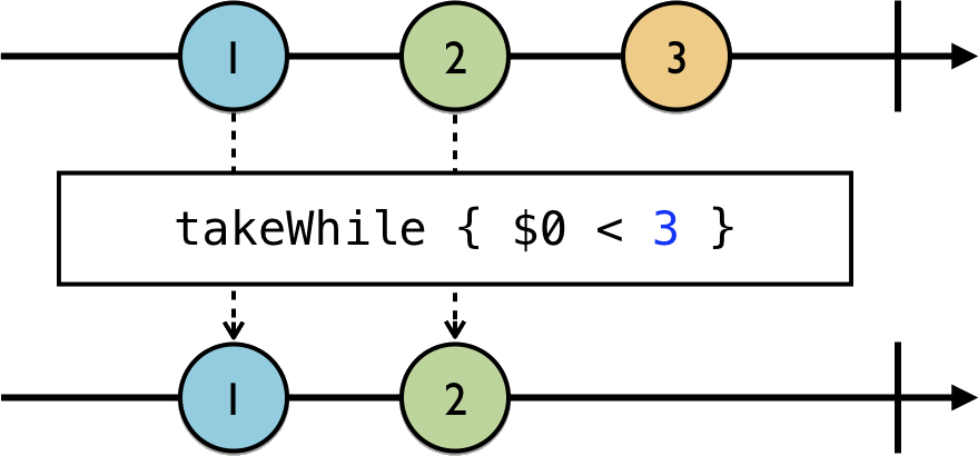 takeWhile은 skipWhile처럼 작동하는데, 위 마블다이어그램과 같이 takeWhile 구문 내에서 설정한 조건에서 true에 해당하는 값을 방출하게 됩니다.