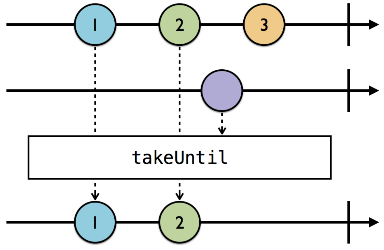 skipUntil은 trigger 역할을 하는 Observable이 subscribe 될 때까지 skip되었다면, takeUntil은 trigger 역할을 하는 Observable이 subscribe되기 전까지의 이벤트값만 받게 됩니다.