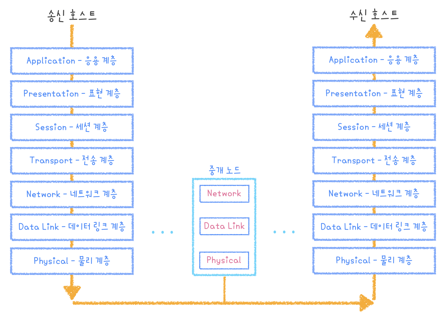 사실 이처럼 송신 호스트에서 수신 호스트로 데이터를 전달하려면 중개 역할을 수행하는 중개 노드를 거쳐야 합니다.