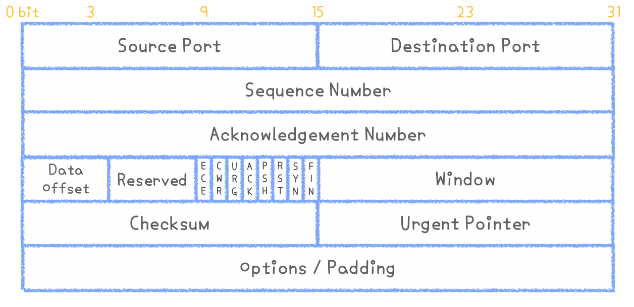 아래 사진은 TCP 헤더의 구조입니다. 연결형 서비스로 신뢰성 있는 전송을 보장하기 때문에 UDP보다 복잡한 구조를 가지고 있습니다.