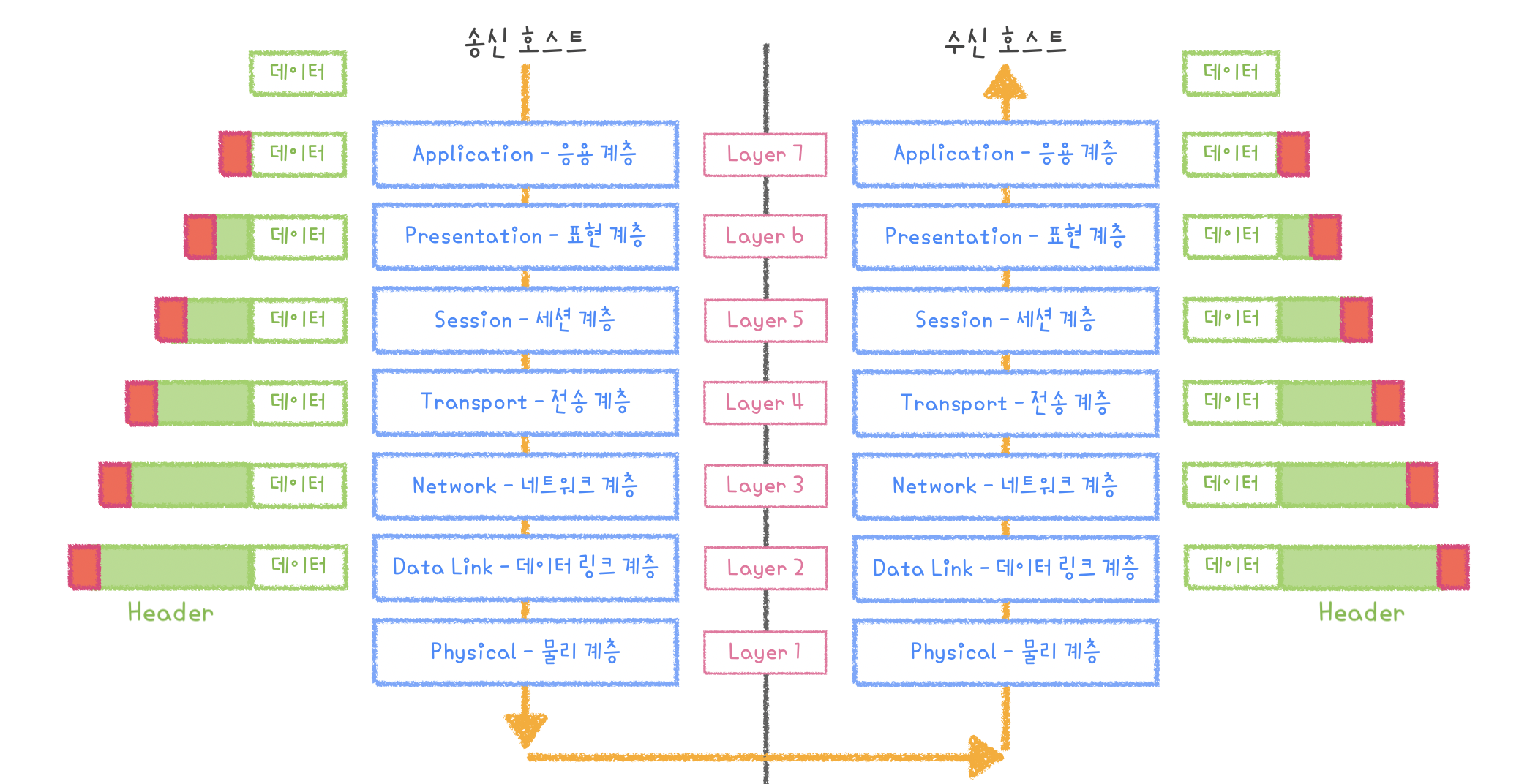 - 데이터를 전송받을 때는 1계층에서 7계층으로 다시 올라오면서 헤더를 하나씩 제거해갑니다.