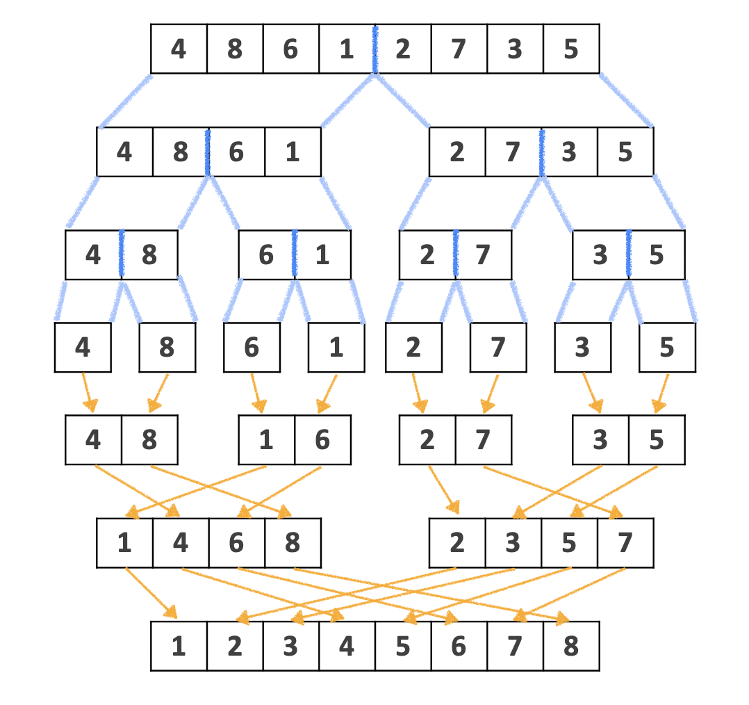 Merge Sort는 전형적인 분할 정복(divide and conquer) 알고리즘의 하나입니다. 시간복잡도 O(n^2)을 가지는 일반적인 정렬과 달리 Merge Sort의 시간 복잡도는 O(nlog_2 n) 이 됩니다.
