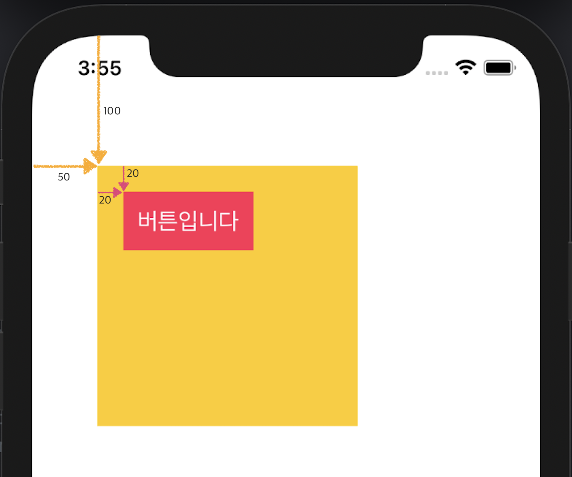 먼저 frame을 살펴보면, sub view는 super view에서 x가 50, y가 100만큼 떨어진 위치에 있다고 해요. 그리고 button은 button의 super view(노란 sub view)에서 x가 20, y가 20만큼 떨어진 위치에 있다고 합니다. 그럼 아래와 같이 나타낼 수 있겠죠?