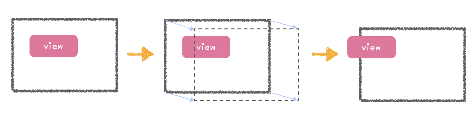 이 상태에서 검은 화면의 bound를 움직이게 되면, 우리가 ScrollView에서 화면을 스크롤 하는 것처럼 화면이 옮겨갑니다. 즉, 분홍색 view 입장에서는 검은 화면의 원래 위치에 그대로 있는거지만 우리가 보는 검은 화면이 움직이면서 분홍색 view가 움직이는 것처럼 보이게 되는 거죠.