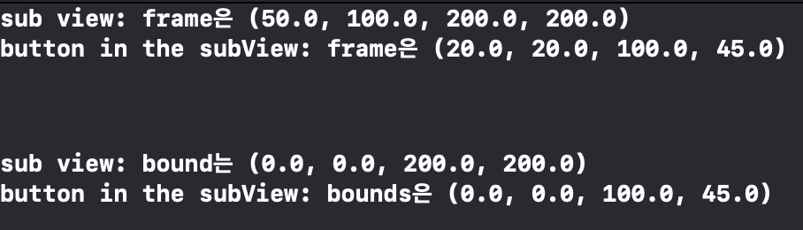 그리고 노란 sub view와 빨간 button의 frame과 bound를 출력해보았죠.