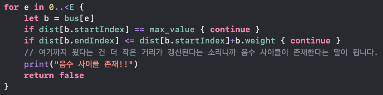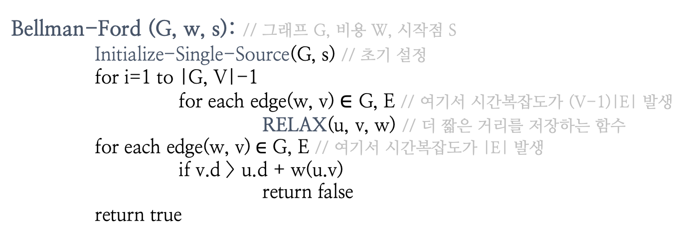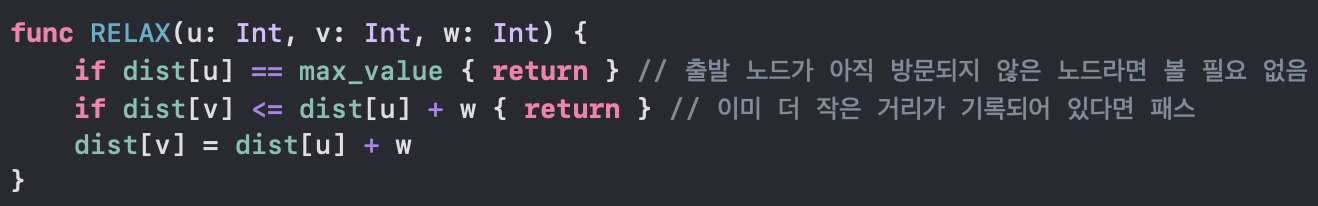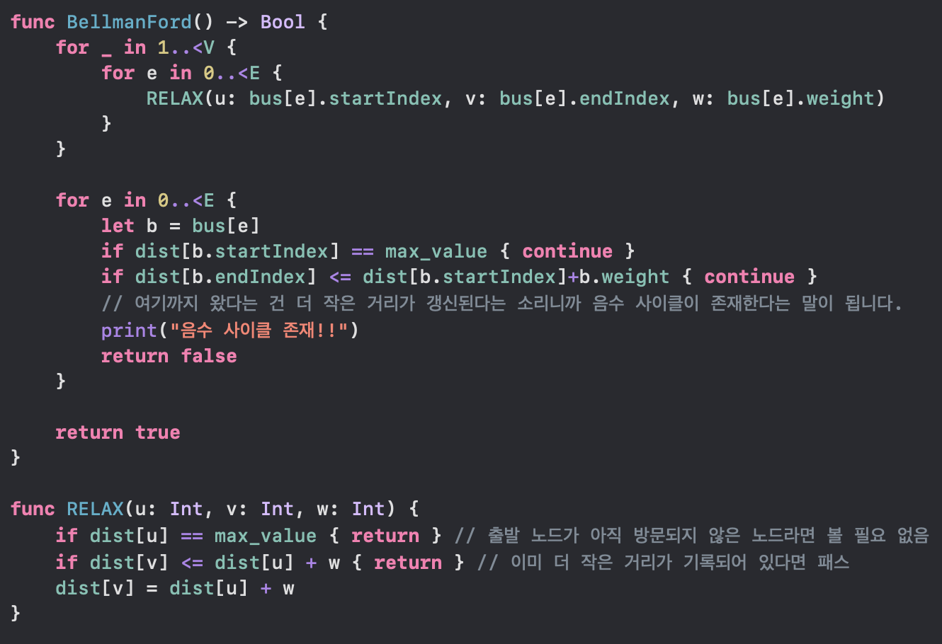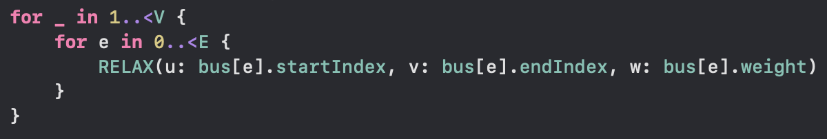 구체적인 벨만-포드 Swift 코드를 보기 전에, 벨만-포드 알고리즘의 구현을 슈도 코드(Pseudo Code)로 먼저 보겠습니다.