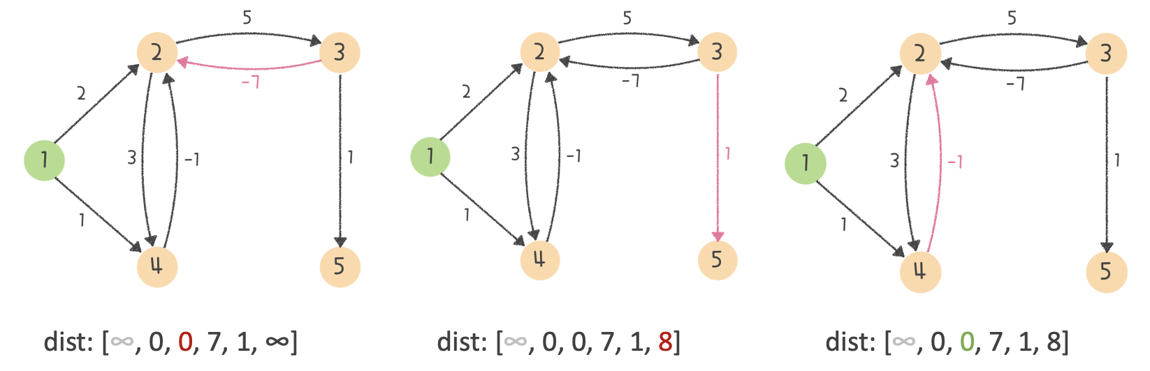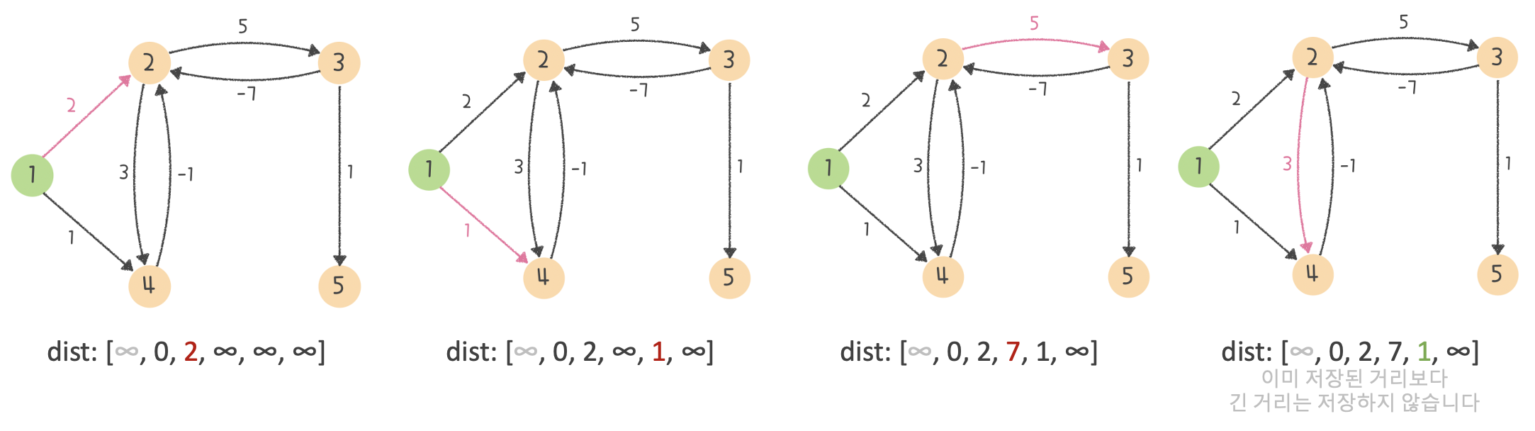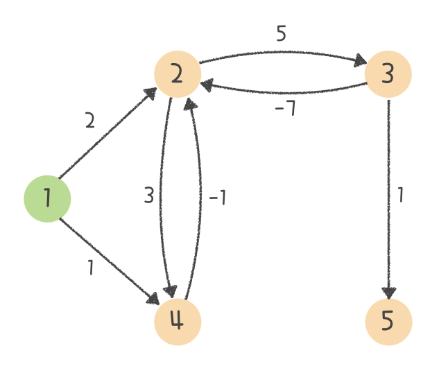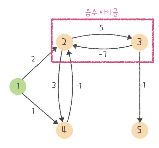 Step 4. 그럼 마지막으로 음수 사이클의 여부를 확인하기 위해 모든 간선 E개를 한 번 더 체크 해줍니다. 그리고 이 과정에서 거리가 한 번 더 갱신되는 경우가 생긴다면?? 바로 음수 사이클이 있다는 소리가 되죠. 그리고 제가 예시로 든 그래프는 아래와 같은 음수 사이클이 발생하게 됩니다 :)