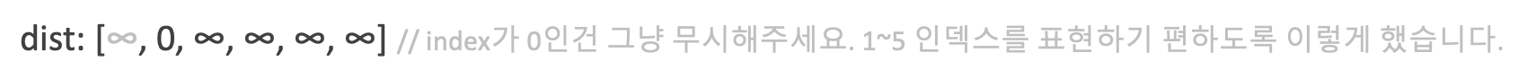 Step 1. 시작 정점부터 다른 정점까지의 거리 값을 무한으로 초기화합니다. (시작 정점은 0)
