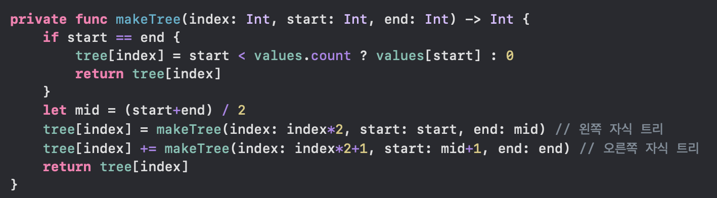즉, init 마지막에 makeTree를 실행하려면 makeTree(1, 0, values.count-1) 을 넣어줘야겠죠?