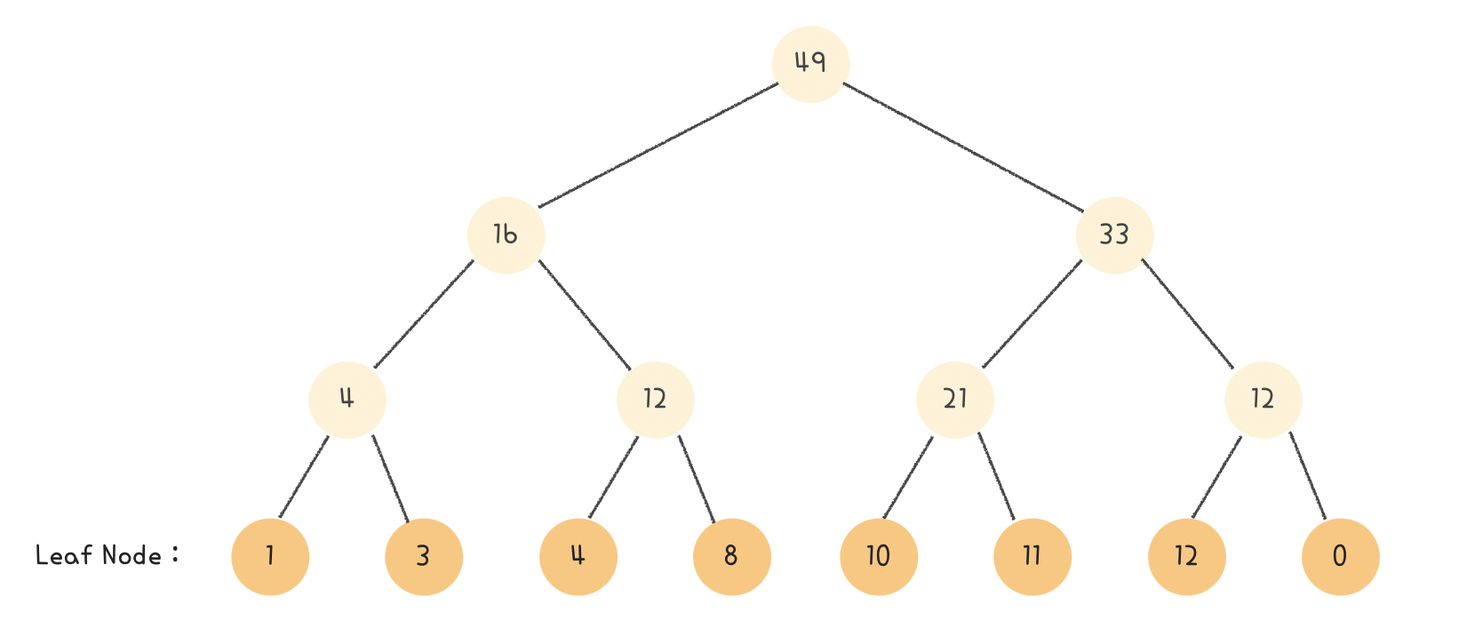 우리는 인덱스 트리를 { 1, 3, 4, 8, 10, 11, 12 } 이라는 배열에 적용해서 각 구간의 합을 알아볼거예요. 만약 이 배열로 인덱스 트리를 구성한다면 아래와 같은 트리를 만들게 될 것입니다.
