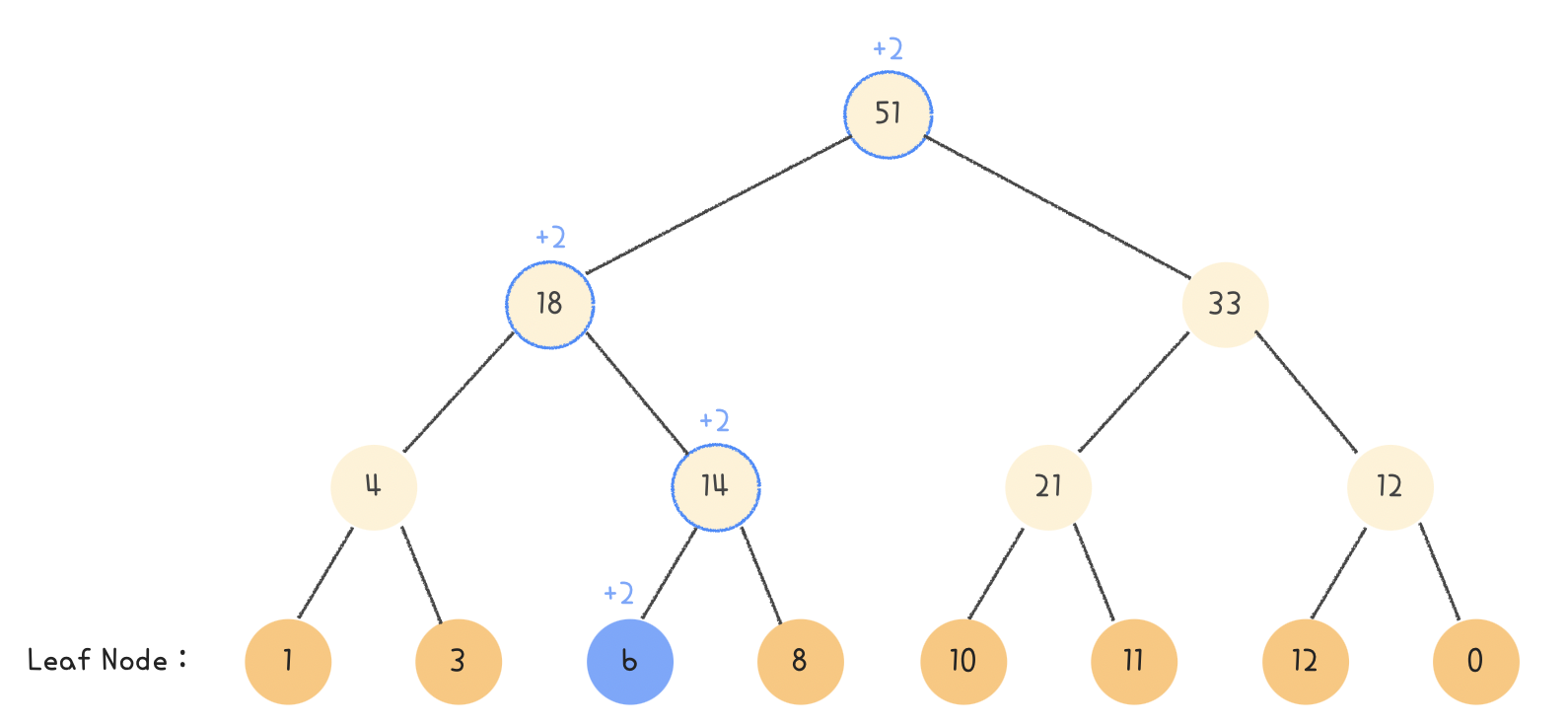 즉, 루트 노드부터 시작해서 update하려는 리프 노드까지 내려가며 diff 값을 더해줍니다. 아래 이미지처럼 말이죠!