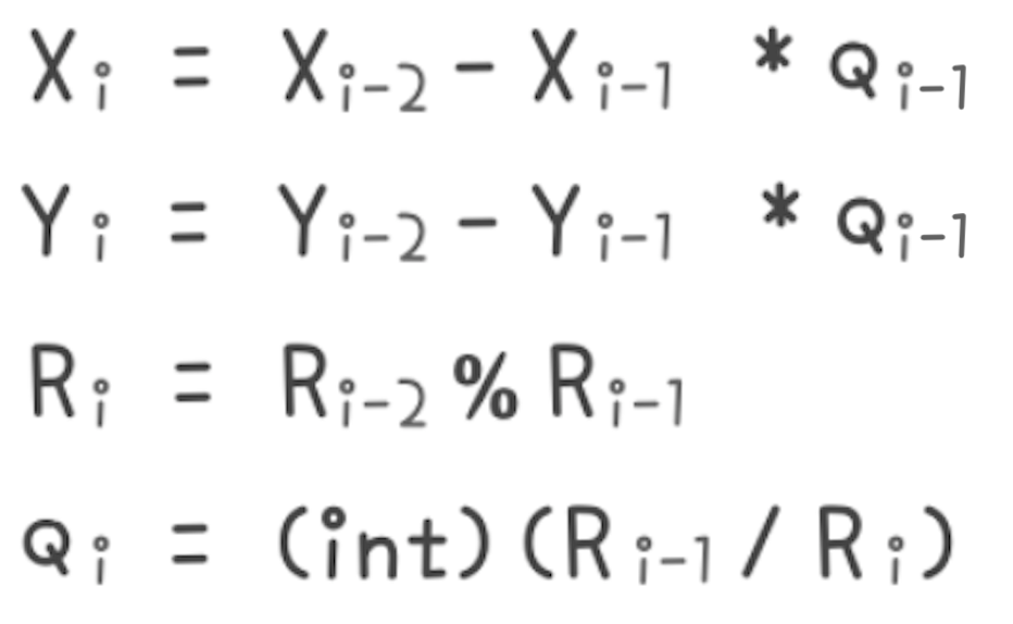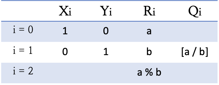 확장 유클리드 호제법을 사용하기 위해 간단한 규칙을 먼저 살펴봐야 합니다. 아래 규칙을 통해서 Ri가 0이 될 때까지 반복했을 때 마지막으로 나온 Xi, Yi가 gcd(a, b)를 만족하는 x, y가 됩니다.