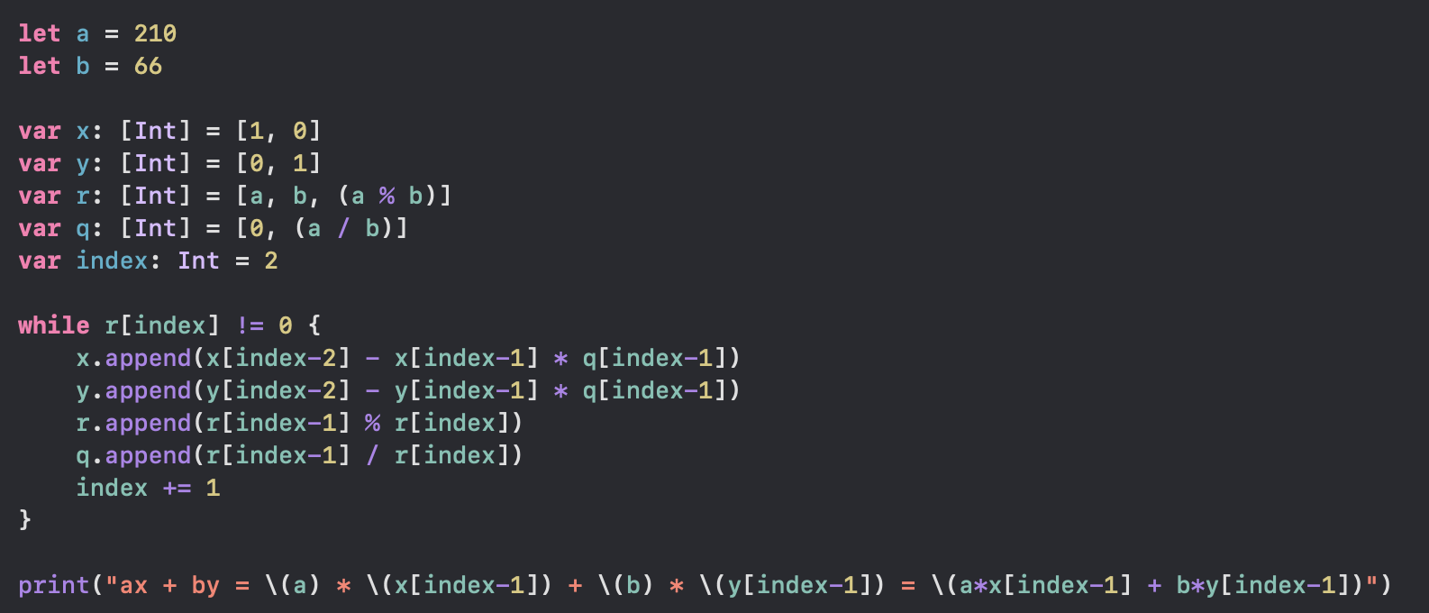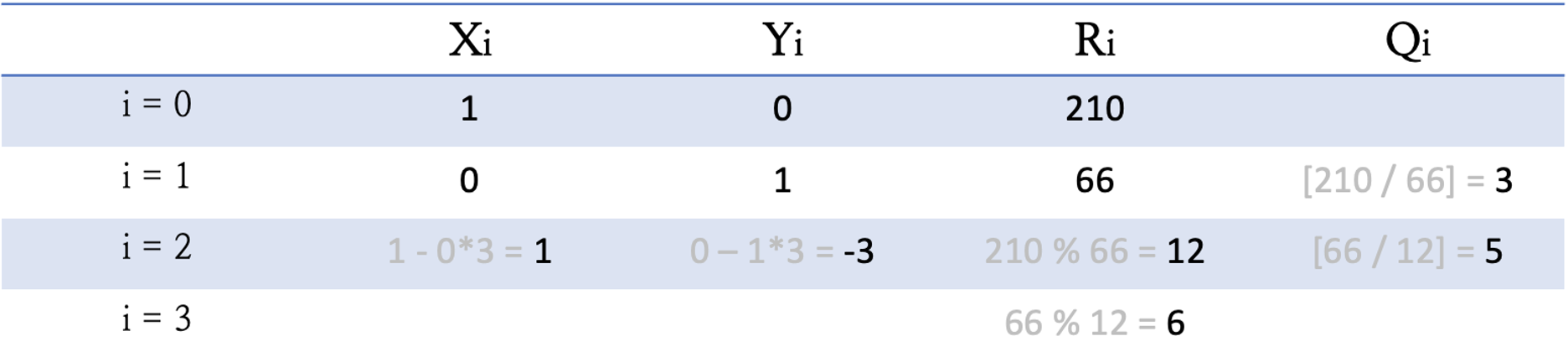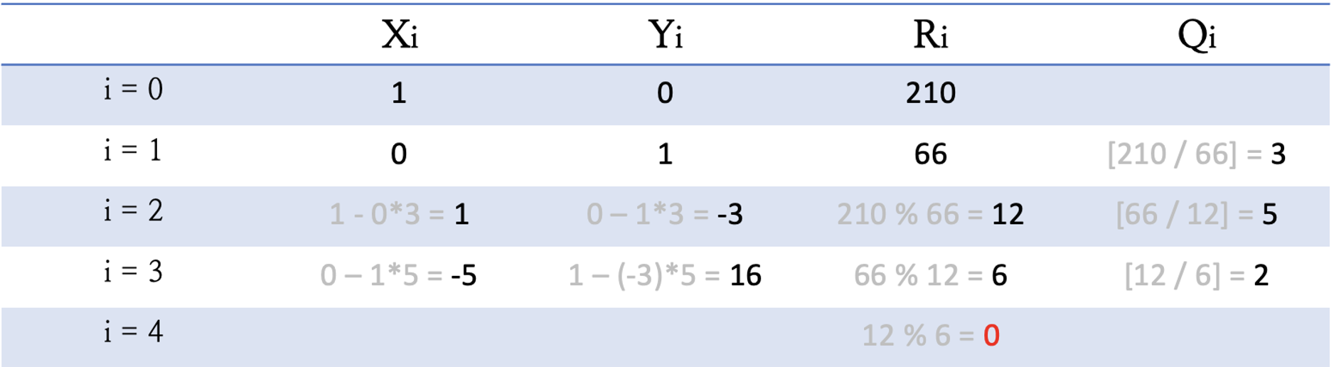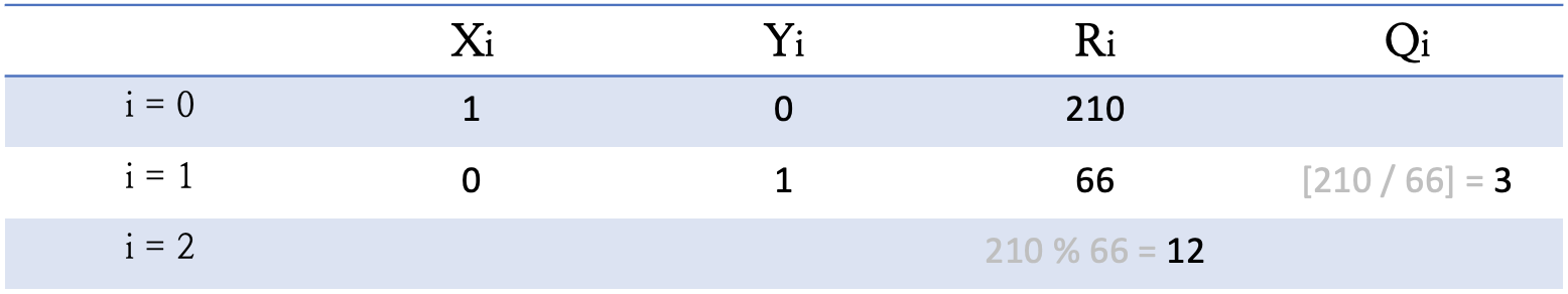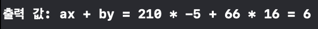 이제 Ri가 0이 되었죠? 그럼 여기서 나온 마지막 X3 와 Y3를 210x + 66y에 대입하면 R3 값인 6이 gcd(210, 66)으로 나오게 됩니다!
