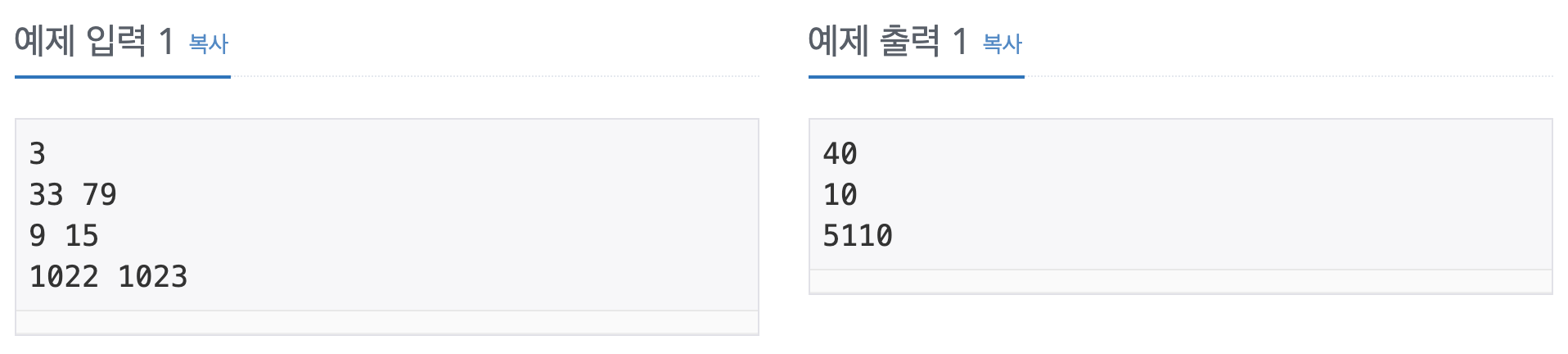 첫 번째 줄에 테스트 케이스의 수 T (1 ≤ T ≤ 50 000)가 주어진다. 이후 T개의 테스트 케이스가 주어진다. 각 테스트 케이스는 한 줄로 구성되어 있으며, 각 줄에는 두 개의 정수 A와 B (1 ≤ A, B ≤ 1 023, A ≠ B)가 공백을 사이로 두고 주어진다. 이는 첫 번째 빈 칸에는 A를, 두 번째 빈 칸에는 B를 넣었을 때 답을 구하라는 의미이다