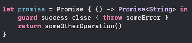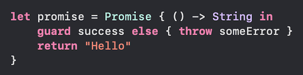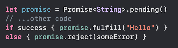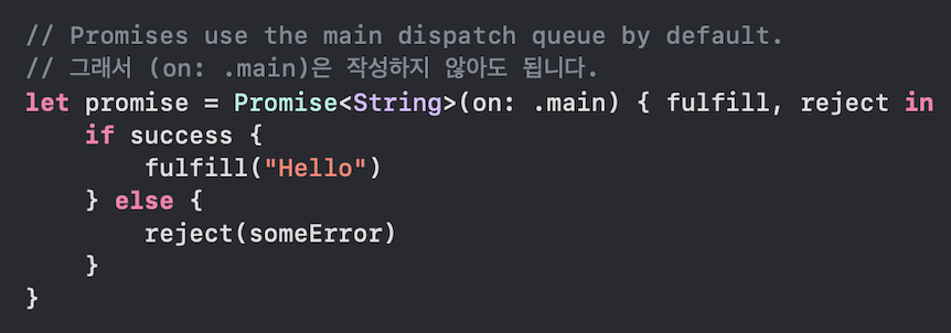 Promises는 Swift에서 비동기처리를 Promise 라는 객체로 묶어서 그 상태 값이 결정 (resolved: fulfill or reject) 되면 다음 동작을 할 수 있게끔 구현한 구조입니다. 여기서 결정된 상태라는 것은 비동기처리의 completion을 말합니다.