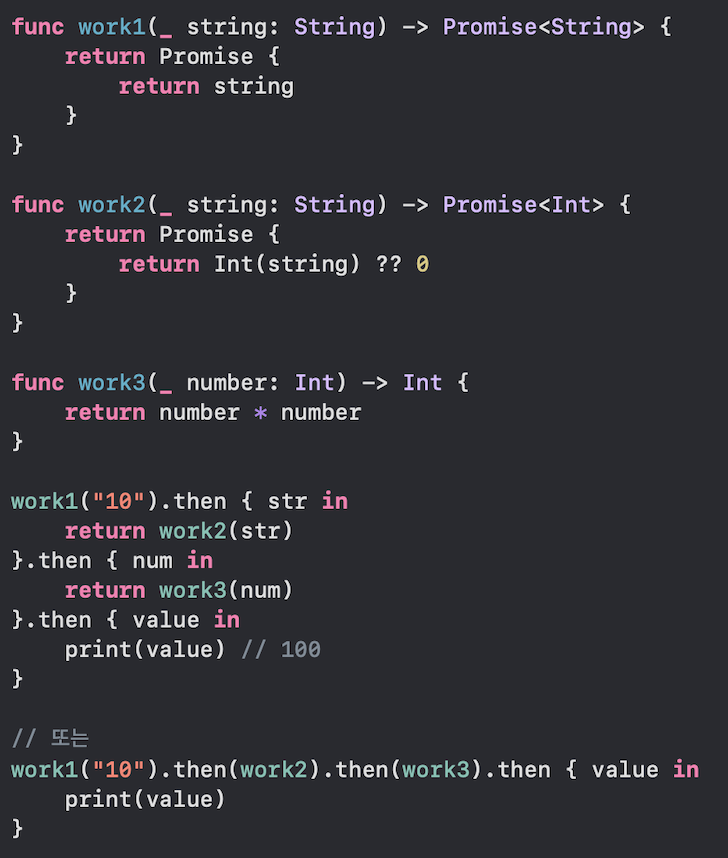 또는, 아래와 같이 작성한다면 아래 promise가 반환하는 Promise<String>을 또 다른 스레드가 체인을 걸 수도 있겠죠?