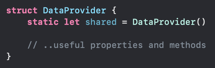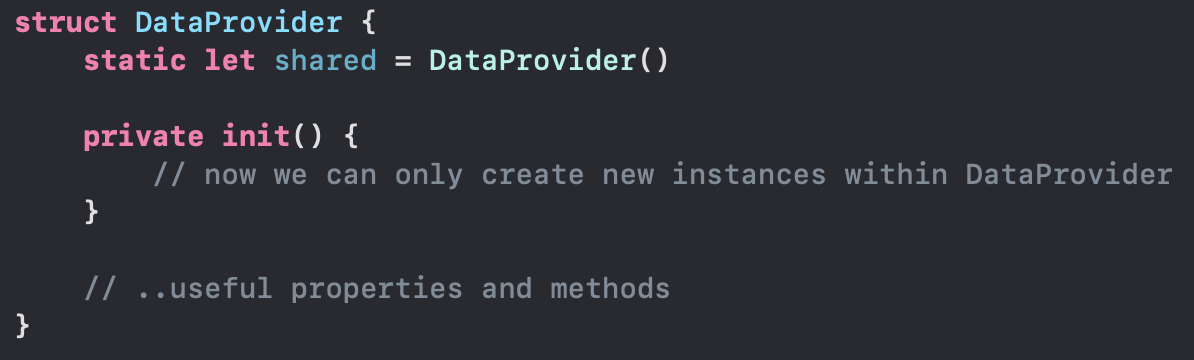 여기서 정말로 올바른 싱글턴 객체를 만들고자 했다면, 우리는 DataProvider의 initializer를 private으로 감싸주었어야 했습니다. initializer가 private으로 감싸져있다는 말은, 더이상 새로운 인스턴스를 생성할 수 없다는 말과 같으니까요 :)