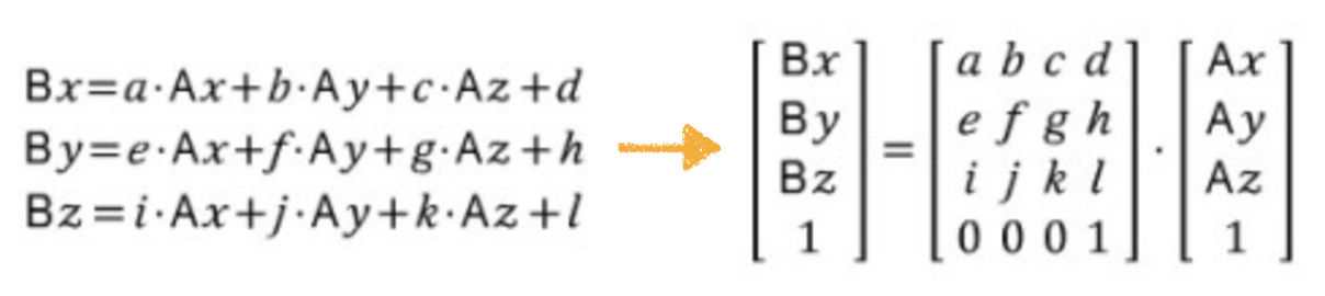 마찬가지로 3D 에서의 두 점 사이의 관계를 표현한 것이 3D 변환입니다. 이는 3개의 연립 방정식으로 표현되고, 하나의 행렬로 표현할 수 있습니다. 즉, 2D 변환의 y = f(x) 처럼 A=TB 형식으로 표현할 수 있다는 말이죠!! 그리고 이 때의 T를 변환 행렬 이라고 합니다.