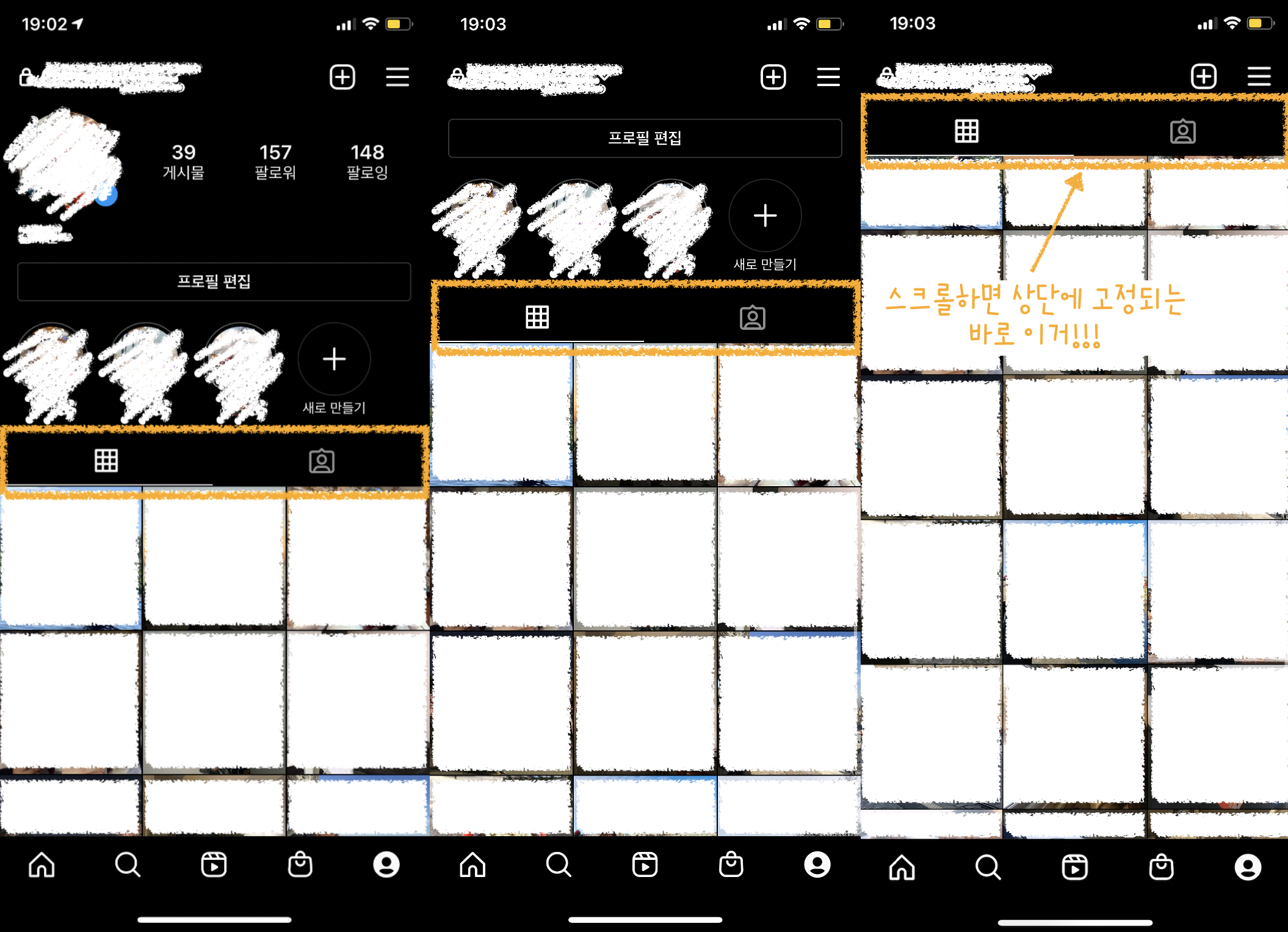 얼마 전에 YAPP 동아리 프로젝트를 진행하다가, 인스타그램 마이프로필 화면처럼 스크롤 했을 때 헤더뷰가 상단에 고정된 상태로 스크롤이 되어야 하는 화면을 구현해야하는 경우가 생겼어요! 아래처럼 말이죠..