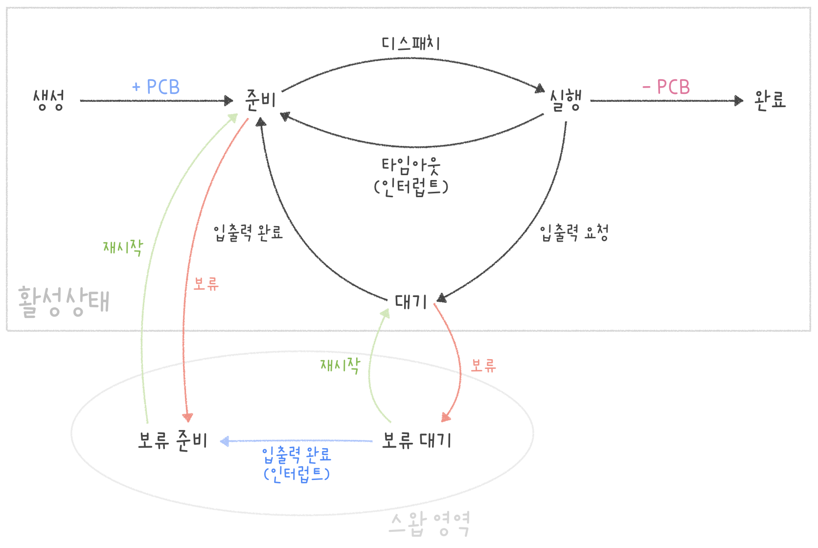 원래 일괄 작업 시스템에서는 단지 생성 (create) - 실행 (run) - 완료 (terminate) 의 상태만 있어도 괜찮았어요. 하지만 시분할 시스템에서는 CPU를 얻어 실행중인 프로세스가 중간에 다른 프로세스에게 CPU에 넘겨주는 일이 빈번하다보니, 좀 더 복잡한 상태를 가지고 있습니다.