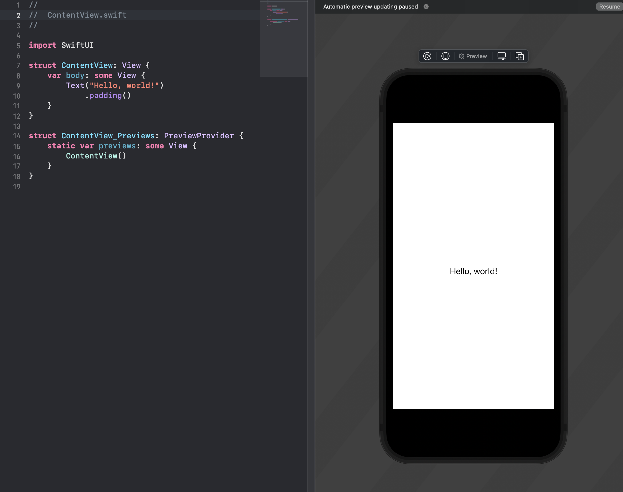 여기서 ContentView.swift를 열어보면 아래와 같은 화면을 보실 수 있습니다. ContentView 클래스 안에서 화면을 구성하고, ContentView_Previews 클래스를 통해 미리보기가 가능하게 되죠. 여기서 볼 수 있는 SwiftUI의 특성 중 하나가 바로 Preview 기능입니다. 코드를 구현하면서 시뮬레이터로 빌드해보지 않아도, 우리가 작성한 코드가 어떤 화면을 구성하고 있는지 바로바로 확인할 수 있게 됩니다. 가끔 맥북이 왕왕 울 때가 있긴 하지만.. 그래도 편리한 기능인 것 같아요 😀