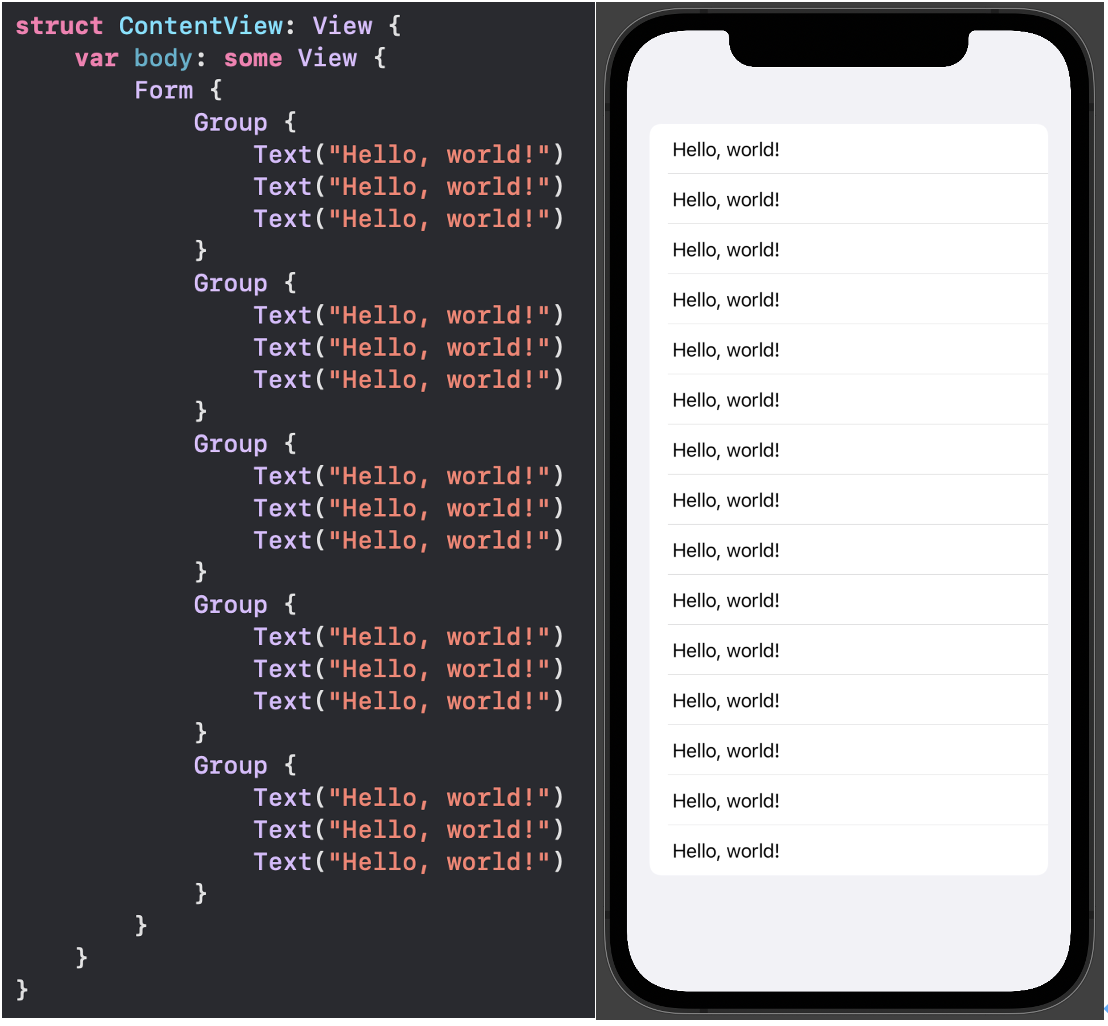 SwiftUI에서 최상위 View는 최대 10개의 Child View를 가질 수 있기 때문에 Form 안에는 최대 10개의 뷰가 들어갈 수 있습니다. 만약 10개를 초과하는 뷰를 가지게 한다면, 아래와 같이 다른 태그들을 이용하여 감싸주어야 합니다.