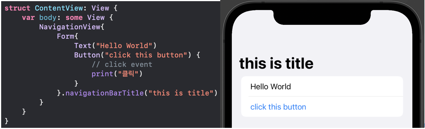화면에서 보일 뷰를 구성하는 Form을 선언하고, Form 블록 끝에 .navigationBarTitle를 달아 네비게이션 타이틀에 보여줄 String을 인자로 넣어줍니다.