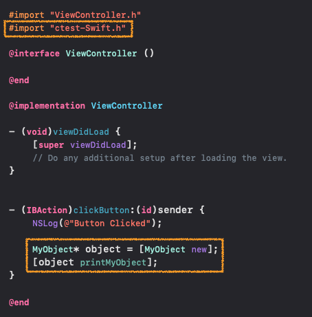 - 그럼 이제 Swift 소스에서 Objective-C로 구현한 부분을 사용할 수 있습니다. 뭐 objc에서 구현된 클래스를 사용하여 객체를 생성한다던가 하는 작업 말이예요!!