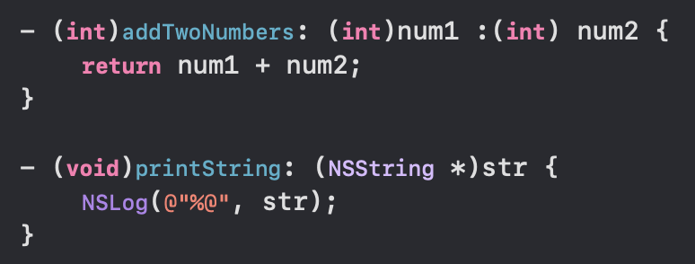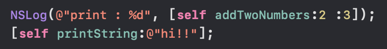 아래 메서드처럼 매개변수의 타입과 이름을 지정해줄 수 있습니다. 그리고 함수를 실행할 때 값을 넣어주게 되는데, 이때 매개변수의 타입이 NSString이라면 @"내용" 과 같은 방식으로 값을" 넣어주어야 합니다. -> 왜???