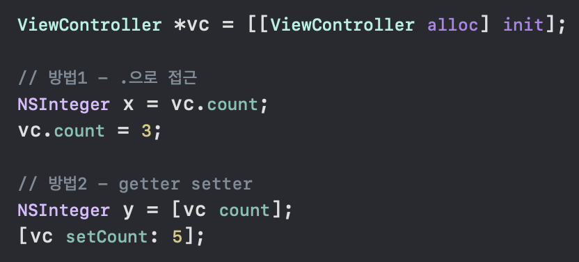 Objective-C에서 변수들은 기본적으로 protected 타입이기 때문에 외부에서 접근할 수 없습니다. 외부에서 접근할 수 있도록 만들고 싶다면, @property를 사용해서 자동으로 getter와 setter를 만들어주도록 합니다. (옵씨에서는 public을 잘 사용하지 않습니다)