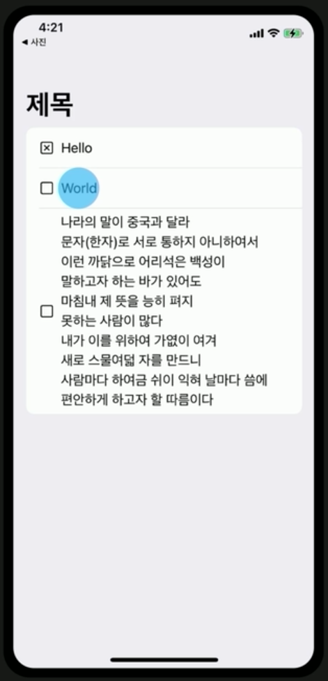 i ) StaticText 요소에 대한 XCUIElementQuery를 생성 - 요소에는 여러 타입이 있기 때문에, 'World' 라는 체크박스를 구성하는 요소 중에서 문자열을 나타내는 화면요소를 뜻하는 StaticText 요소를 먼저 조회합니다.