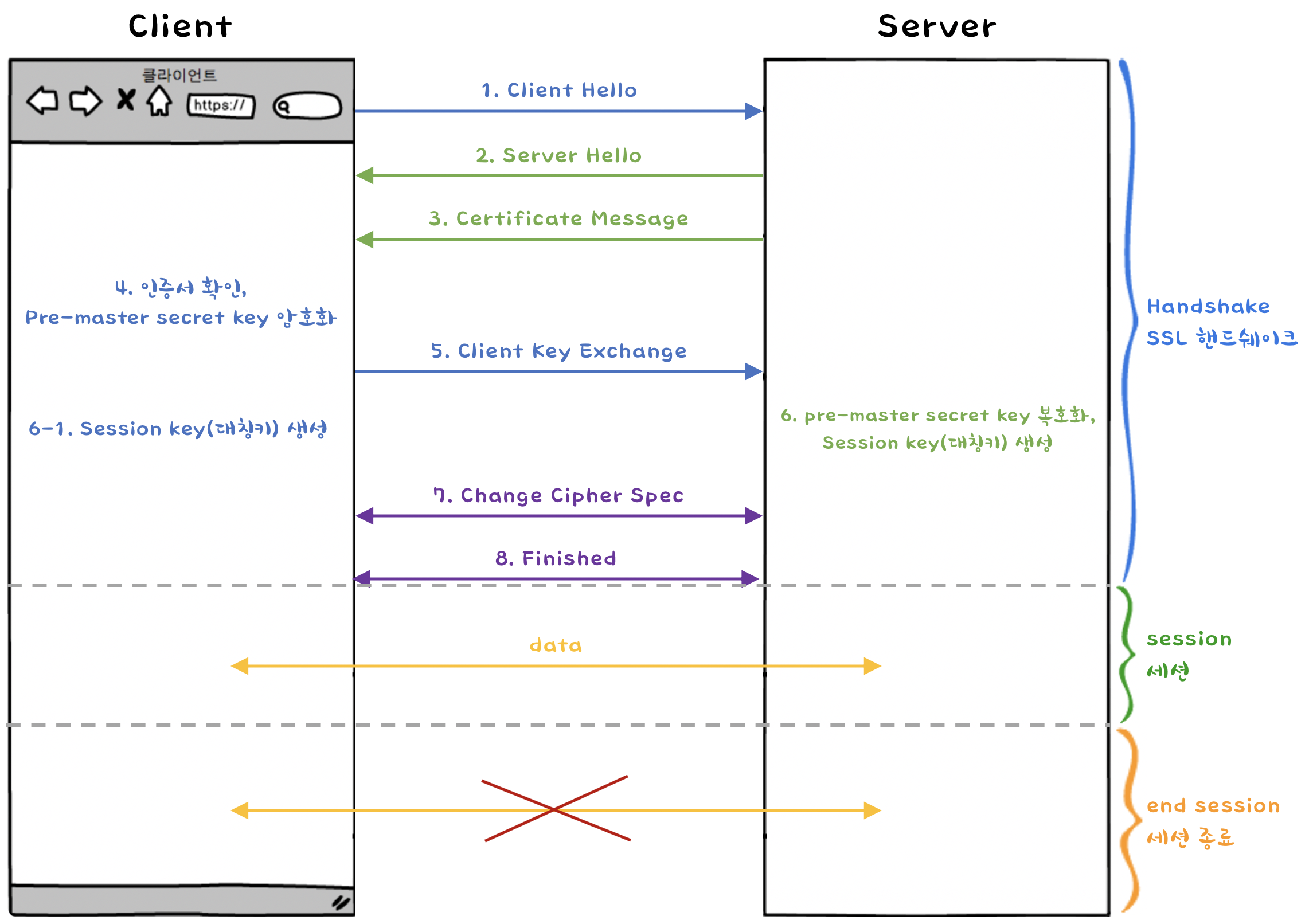 - 서로에게 앞으로 모든 통신 내용은 세션키(대칭키)로 암호화하여 통신할 것이라고 메시지를 보내 알려줍니다.